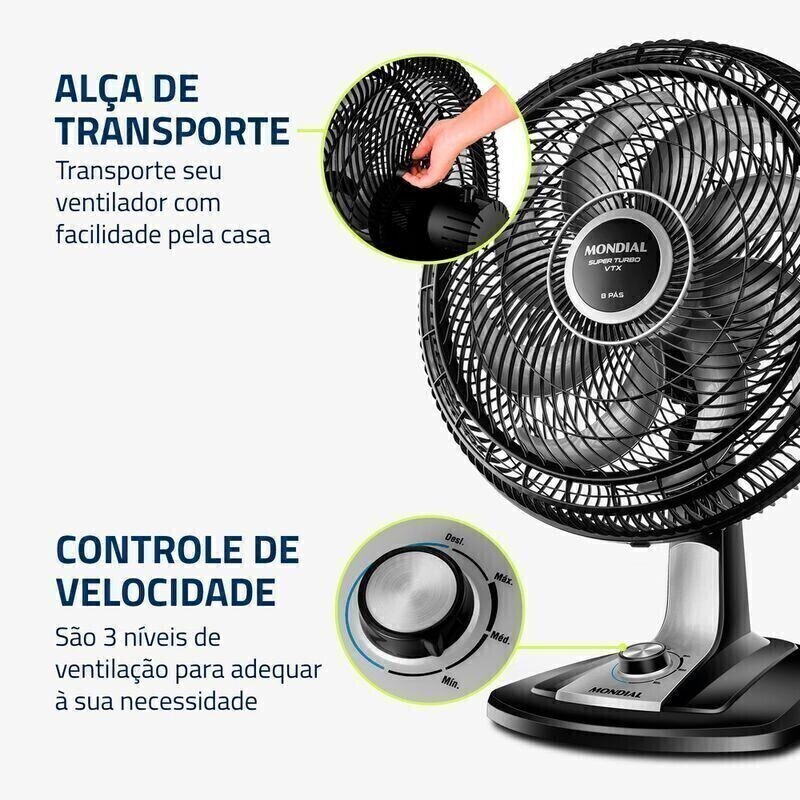 O ventilador de mesa Super Turbo VTX-40-8P possui 40 cm de diâmetro e hélice de 8 pás, o que promove uma circulação de ar mais eficiente e garante mais frescor ao ambiente. O sistema de ventilação alia a potência para refrescar ao baixo nível de ruído, proporcionando o silêncio necessário para momentos de concentração e uma excelente noite de sono.